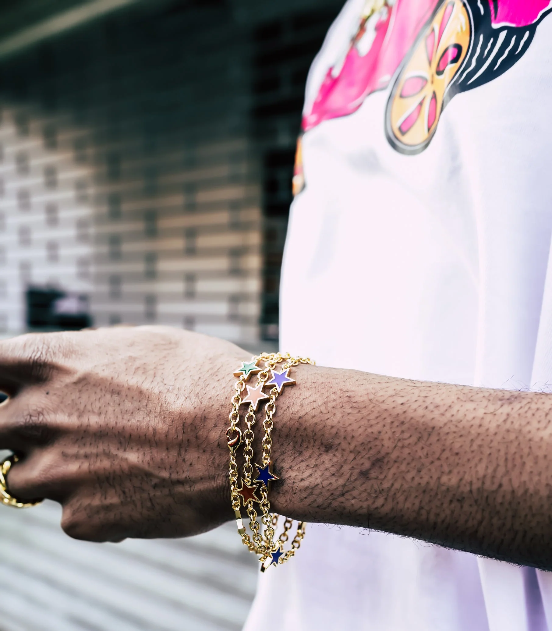 The bracelet comes with a branded pouch, adding to its luxurious appeal. At a standard length of 8 inches, it is designed to fit most wrists comfortably. The links on the bracelet measure 4mm, while the stars are 12mm and colored with enamel on both sides, making it a bold and eye-catching piece of jewelry.